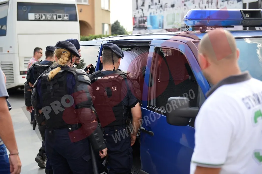 FOTO EXCLUSIV: O parte dintre fanii Legiei, opriți de jandarmi la intrarea în București! 13 suporteri polonezi au fost reținuți și duși la secție