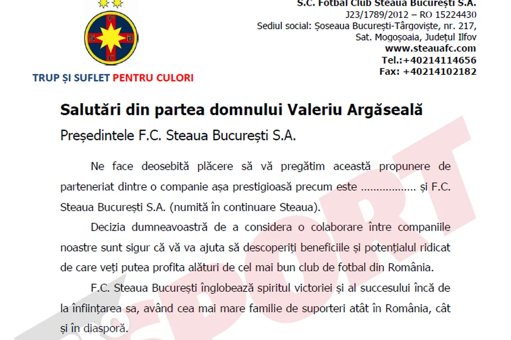 FOTO EXCLUSIV | „Salutări din partea domnului Argăseală!” ProSport vă prezintă scrisoarea de intenții cu care FCSB îi ademenește pe partenerii de afaceri. E exact așa cum v-o închipuiți, doar că un pic mai tare