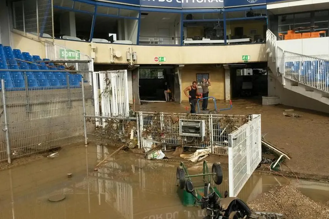 FOTO | Imagini apocaliptice de pe stadionul lui Montpellier. Gazonul a fost transformat în nămol, tribunele și vestiarele au fost inundate