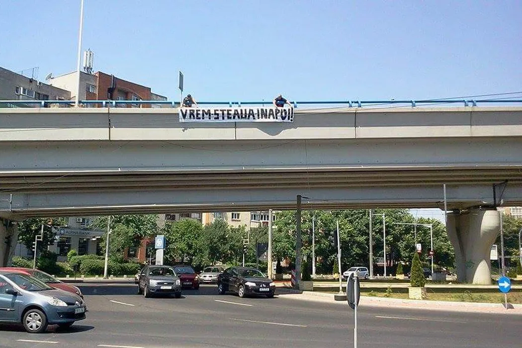 FOTO | Protest în tot Bucureștiul. Fanii Stelei au afișat bannere și în fața porții lui Gigi Becali: „Dreptate pentru Steaua”