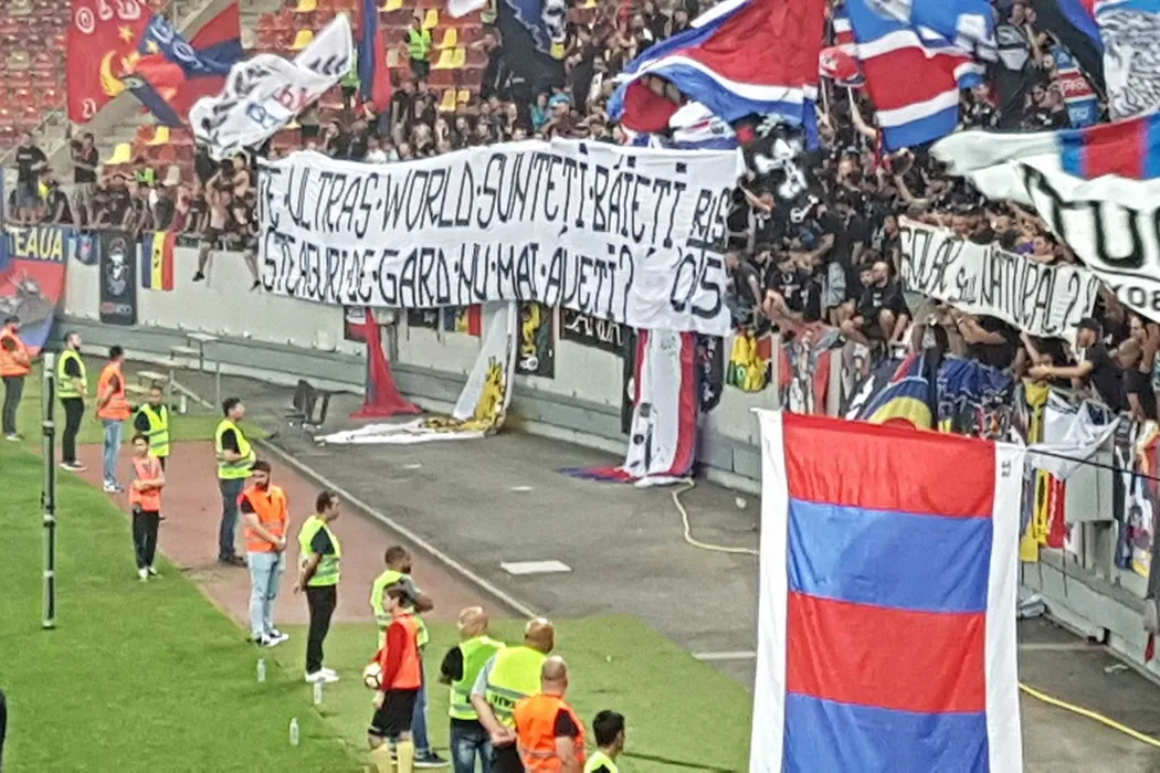 FOTO | S-au încins spiritele pe Arena Națională: ironiile-buzdugan aruncate de fanii steliști spre suporterii giuleșteni