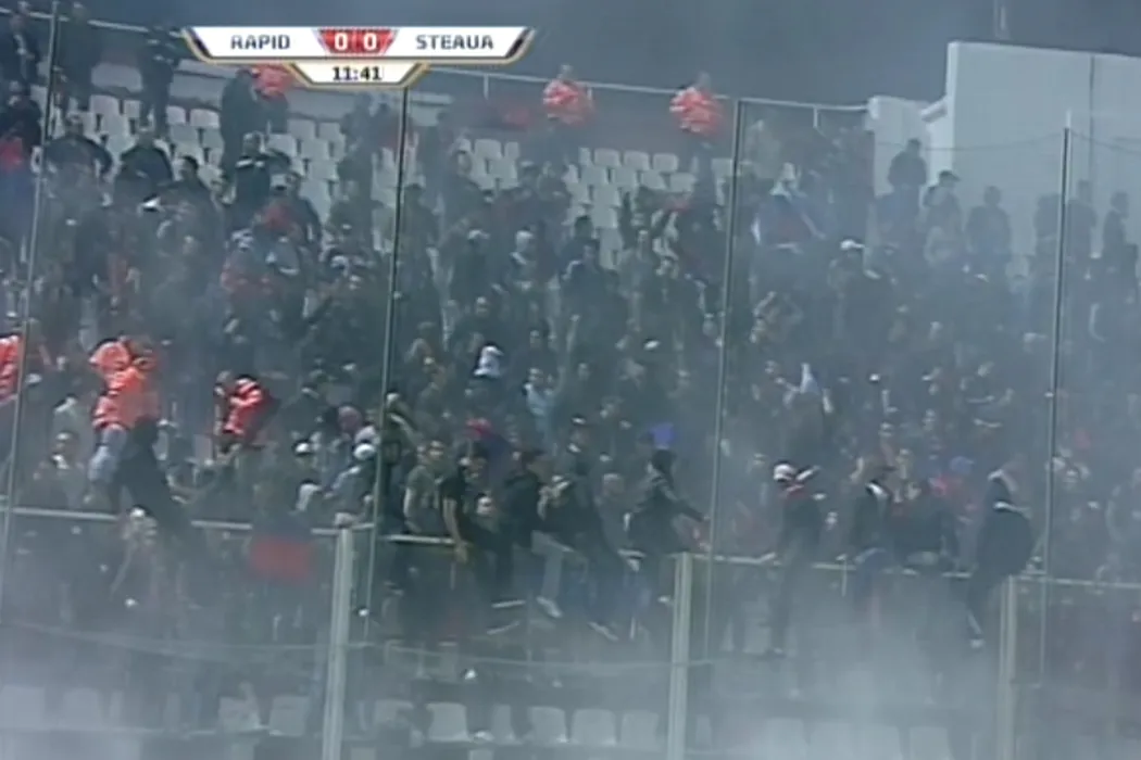 FOTO Steliștii și-au dat din nou în petec!** Meciul a fost întrerupt după ce fanii au aruncat cu petarde în teren! Galeria a fost evacuată!