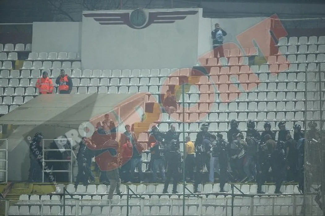 FOTO Steliștii și-au dat din nou în petec!** Meciul a fost întrerupt după ce fanii au aruncat cu petarde în teren! Galeria a fost evacuată!
