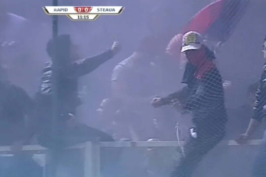 FOTO Steliștii și-au dat din nou în petec!** Meciul a fost întrerupt după ce fanii au aruncat cu petarde în teren! Galeria a fost evacuată!