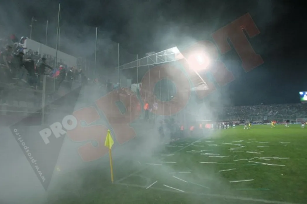 FOTO Steliștii și-au dat din nou în petec!** Meciul a fost întrerupt după ce fanii au aruncat cu petarde în teren! Galeria a fost evacuată!