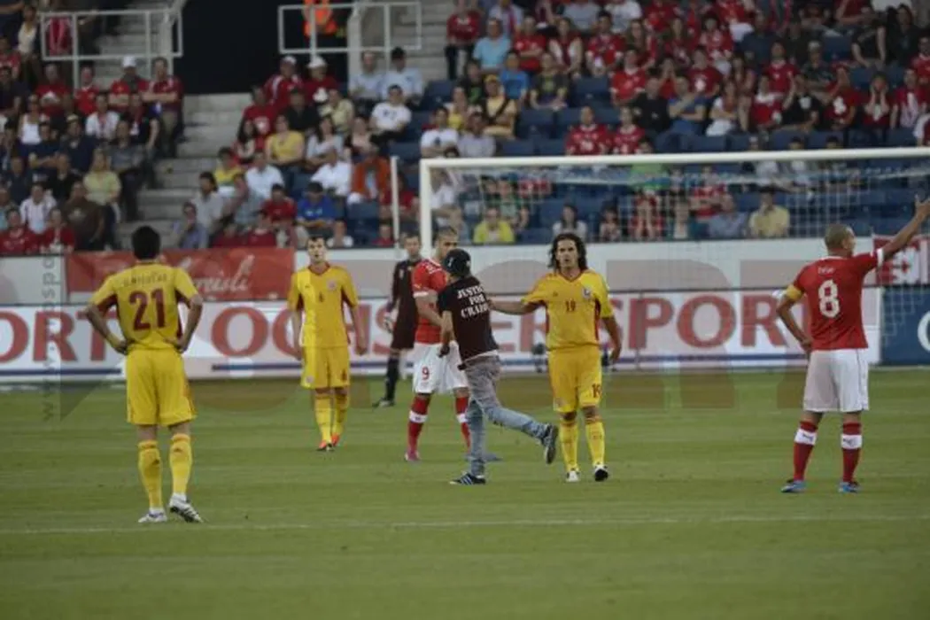 FOTO Un fan al Craiovei a intrat pe teren în timpul meciului Elveția – România: „Justice for Craiova!”** Meciul, întrerupt câteva clipe