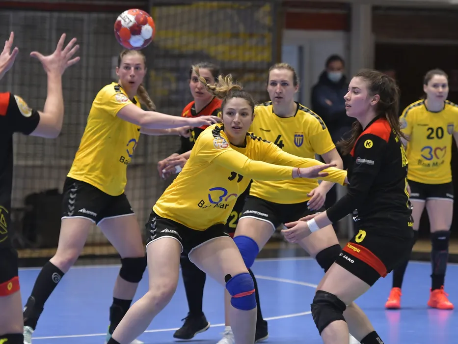 Anca-Georgiana Polocoser, Yaroslava Burlachenko si Iulia Maria Andrei in meciul de handbal feminin dintre Dacia Mioveni si Minaur Baia Mare, contand pentru Liga Florilor, desfasurat fara spectatori in Sala Traian din Ramnicu Valcea, marti 9 martie 2021. © FOTO:Razvan Pasarica/SPORT PICTURES
