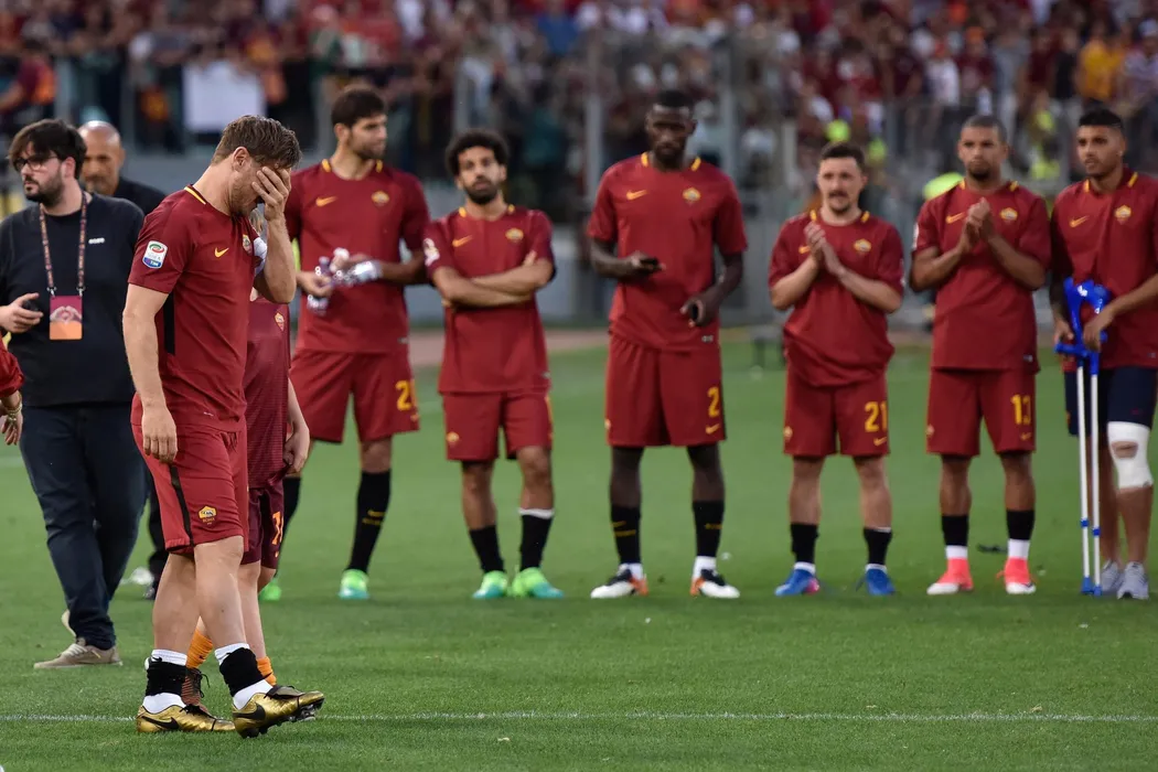 ROME, ITALY - MAY 28 : Players of A.S Roma applause as Francesco Totti (2nd L) gestures after the Serie A Week 38 match between A.S. Roma and Genoa CFC at Stadio Olimpico in Rome, Italy on May 28, 2017. Team captain of A.S. Roma Francesco Totti quits soccer, after carrying the yellow-red jersey since 1993. Thousands of fans, supported Totti in the ceremonies ahead of the game and after the game. Claudio Pasquazi / Anadolu Agency