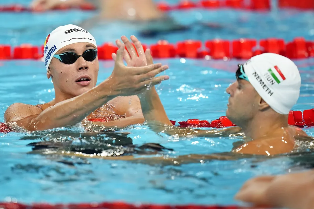 David Popovici, left, of Romania, gestures to Nandor Nemeth, of Hungary, following their heat in the men's 100-meter freestyle at the 2024 Summer Olympics, Tuesday, July 30, 2024, in Nanterre, France.,Image: 894074437, License: Rights-managed, Restrictions: This content is intended for editorial use only. For other uses, additional clearances may be required., Model Release: no, Pictured: David Popovici,Nandor Nemeth