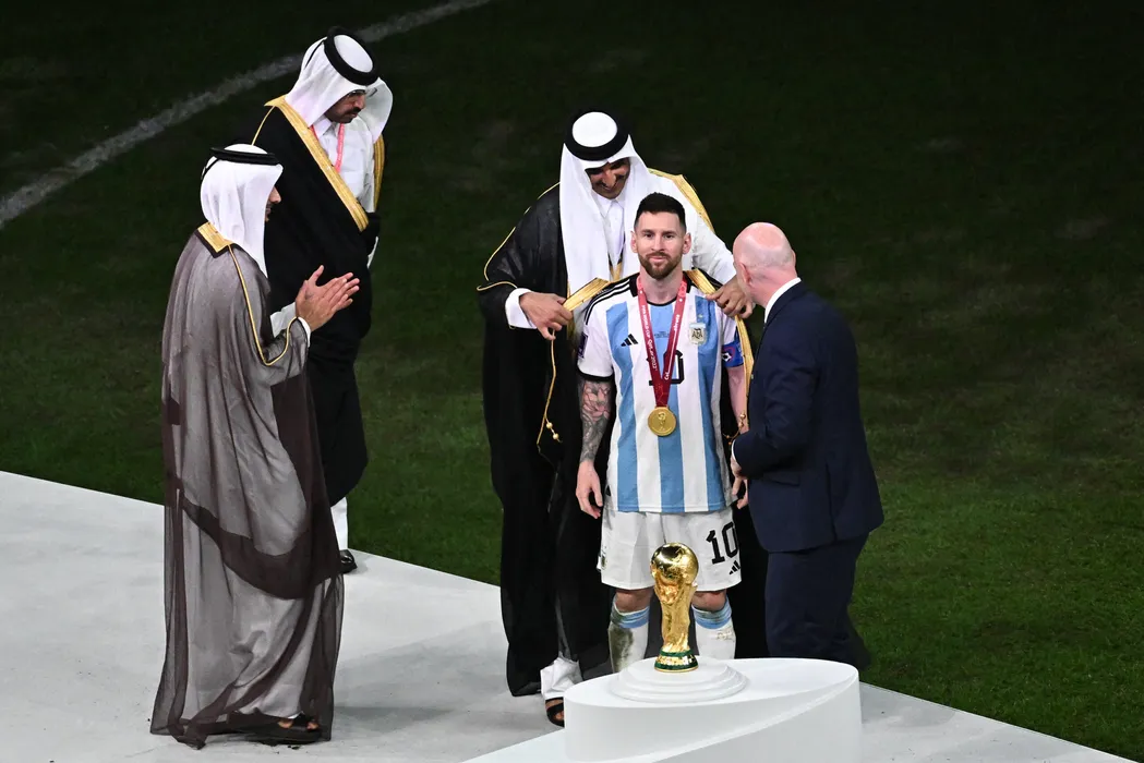 Lionel Messi of Argentina receives a robe from Tamim bin Hamad Al Thani the Emir of Qatar during the FIFA World Cup Qatar 2022 Final match between Argentina and France at Lusail Stadium on December 18, 2022. Photo by Laurent Zabulon/ABACAPRESS.COM