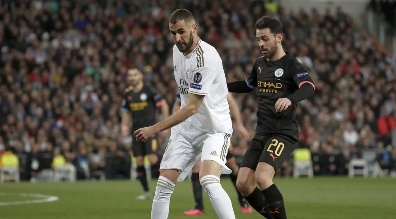 MADRID, SPAIN - FEBRUARY 26: Karim Benzema (L) of Real Madrid argues with Bernardo Silva (R) of Manchester City during the UEFA Champions League round of 16 first leg soccer match between Real Madrid and Manchester City at Santiago Bernabeu in Madrid, Spain on February 26, 2020. Burak Akbulut / Anadolu Agency/ABACAPRESS.COM,Image: 501326843, License: Rights-managed, Restrictions: , Model Release: no