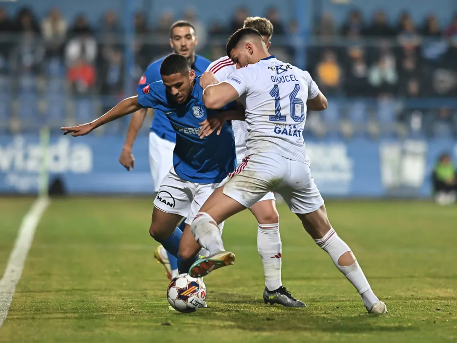 Rivaldinho (Mosca Rivaldo Vitor Ferreira) si Costin Petruț Ghiocel în meciul de fotbal dintre Farul Constanta si Otelul Galati, contând pentru Superliga Superbet, desfășurat pe Stadionul central al Academiei Gheorghe Hagi din Ovidiu, sambata 24 februarie 2024. © FOTO: Răzvan PĂSĂRICĂ/SPORT PICTURES
