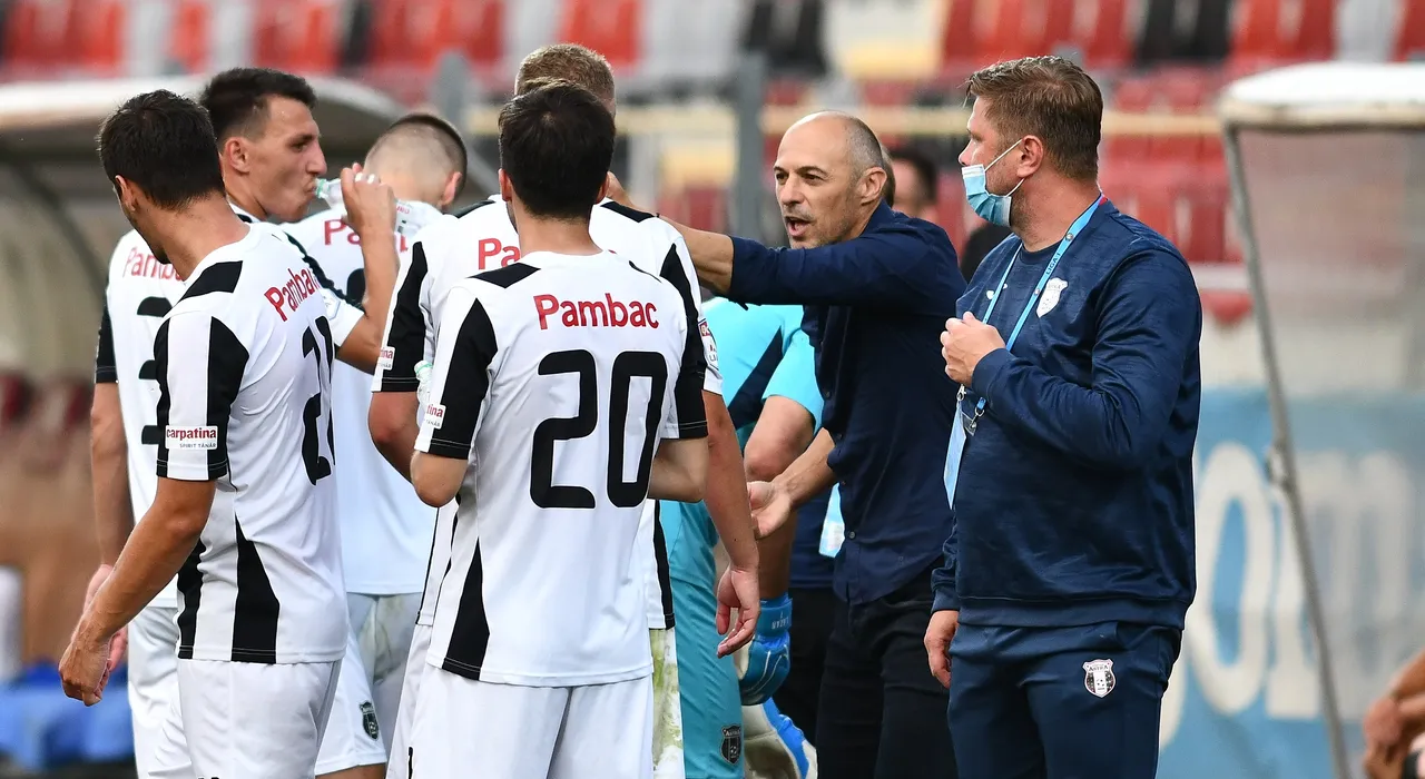 Bogdan Andone alaturi de fotbalistii de la Astra la o pauza de hidratare in meciul de fotbal dintre Astra Giurgiu si FCSB, contand pentru play-off-ul Ligii 1 Casa Pariurilor, disputat fara spectatori pe Stadionul Marin Anastasovici din Giurgiu, luni 29 iunie 2020. © FOTO:Razvan Pasarica/SPORT PICTURES