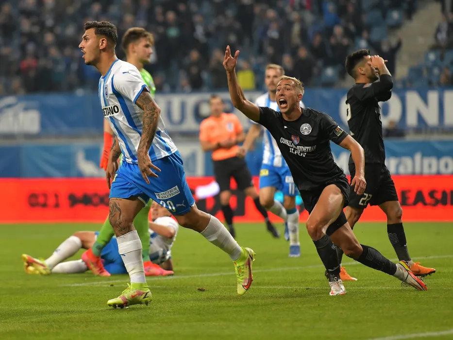 Jovan Markovic se bucura dupa un gol marcat spre disperarea lui Denis Ventura in meciul de fotbal dintre Universitatea Craiova si Academica Clinceni, contand pentru Liga 1 Casa Pariurilor, desfasurat pe Stadionul Ion Oblemenco din Craiova, luni 18 octombrie 2021. © FOTO:Razvan Pasarica/SPORT PICTURES