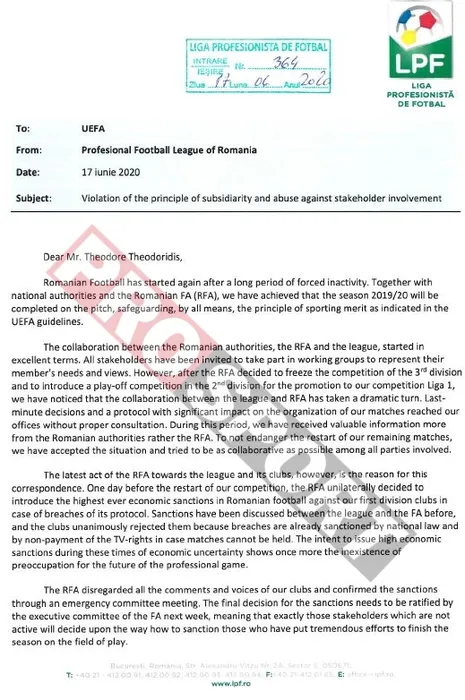 FRF, pârâtă de către LPF la UEFA! Scrisoare incredibilă trimisă către forul internațional: „E datoria noastră să raportăm acest abuz de putere” | DOCUMENT OFICIAL EXCLUSIV