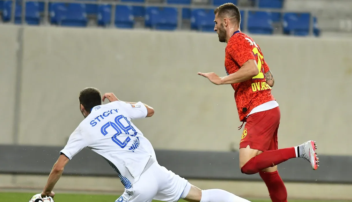 Ovidiu Popescu il faulteaza in careu pe Mihai Valentin Mihaila in meciul de fotbal dintre Universitatea Craiova si FCSB, contand pentru play-off-ul Ligii 1 Casa Pariurilor, disputat fara spectatori pe Stadionul Ion Oblemenco din Craiova, duminica 12 iulie 2020. © FOTO:Razvan Pasarica/SPORT PICTURES