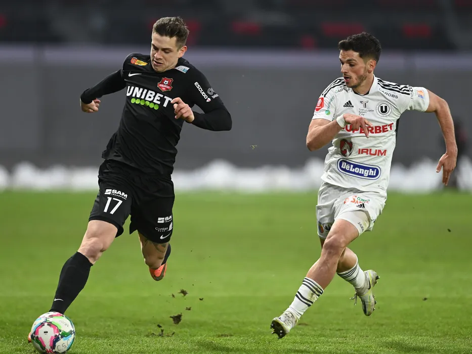Mihai Ionut Butean si Gabriel Dorinel Oancea in meciul de fotbal dintre FC Hermannstadt si Universitatea Cluj, contand pentru Cupa Romaniei, desfasurat pe Stadionul Municipal din Sibiu, miercuri 5 aprilie 2023. © FOTO:Razvan Pasarica/SPORT PICTURES