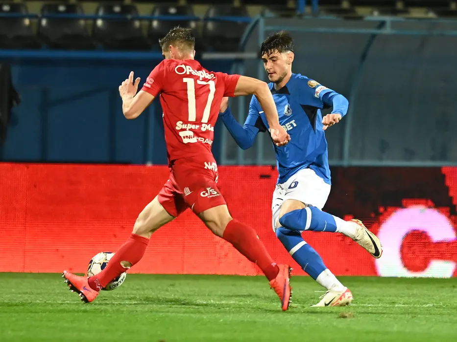 Mihai Ionut Butean si Adrian Mazilu in meciul de fotbal dintre Farul Constanta si FC Hermannstadt, contand pentru Superliga Superbet, desfasurat pe Stadionul central al Academiei Gheorghe Hagi din Ovidiu, sambata 11 noiembrie 2023. © FOTO:Razvan Pasarica/SPORT PICTURES