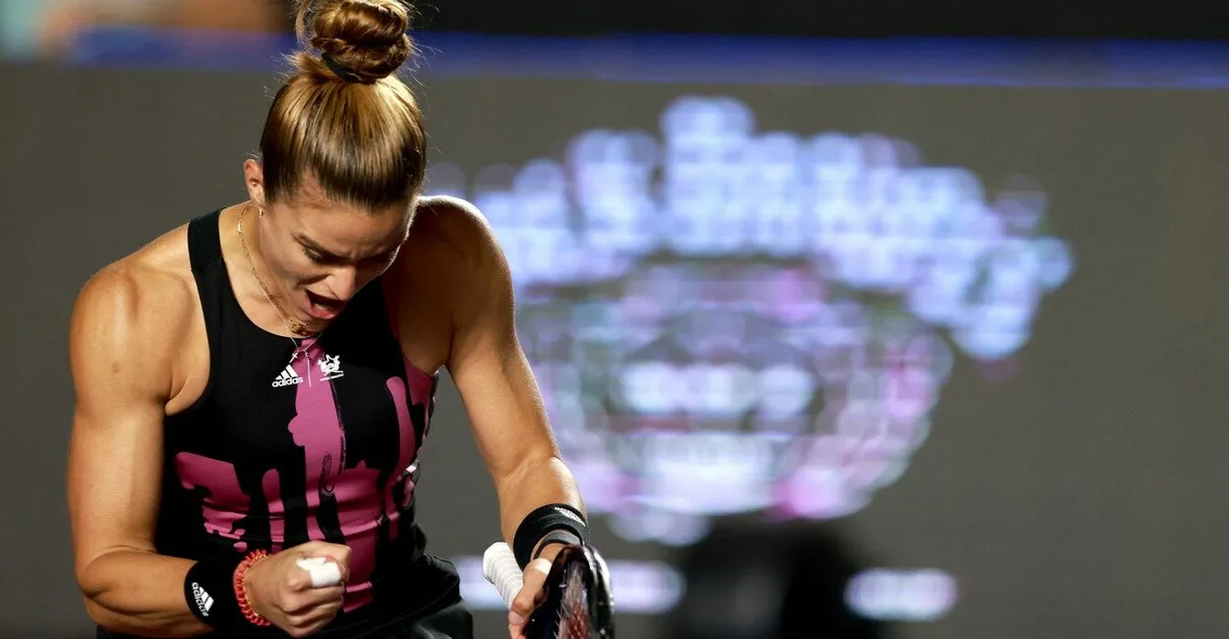 Greece's Maria Sakkari celebrates defeating US' Danielle Collins after the WTA 2022 Tournament Women's Singles tennis match in Zapopan, Jalisco state Mexico, on October 20, 2022.,Image: 732193510, License: Rights-managed, Restrictions: , Model Release: no