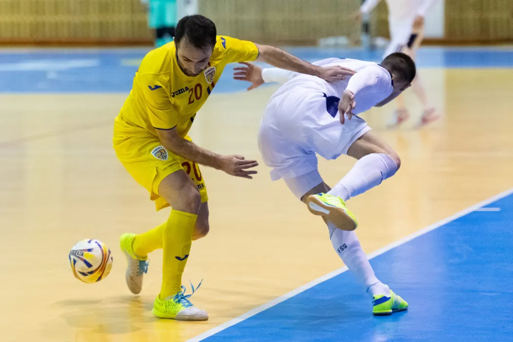 Adrian Panzaru (stanga) in timul meciului de futsal dintre echipele nationale ale Romaniei si Serbiei, contand pentru preliminariile Euro 2022 din Olanda, disputat in Sala Constantin Jude din Timisoara, joi, 28 ianuarie 2021- Leczki Jozsi/Mediafax Foto