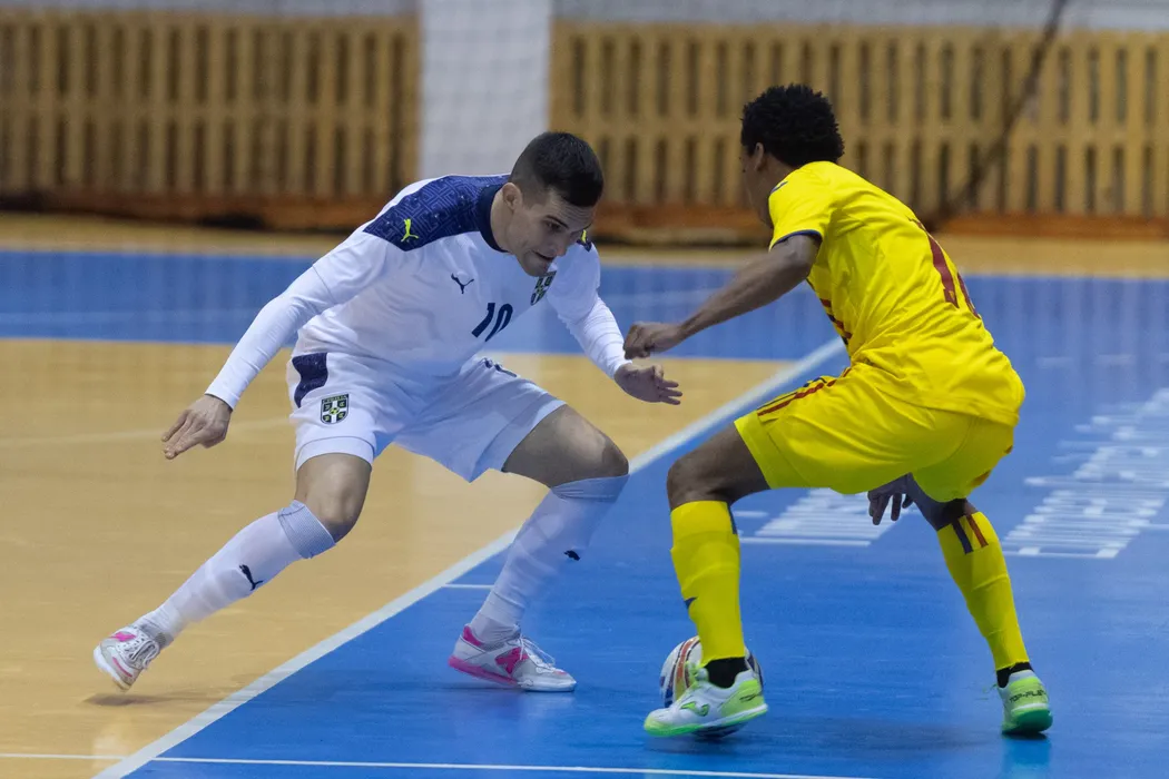 Strahinja Petrov (stanga) si Savio Valadares (dreapta) in timpul meciului de futsal dintre echipele nationale ale Romaniei si Serbiei, contand pentru preliminariile Euro 2022 din Olanda, disputat in Sala Constantin Jude din Timisoara, joi, 28 ianuarie 2021- Leczki Jozsi/Mediafax Foto