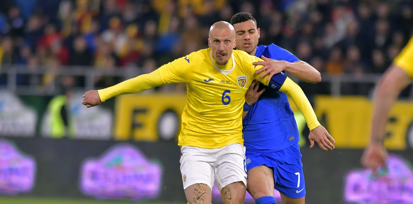 Vlad Chiricheş si Giorgos Giakoumakis in meciul amical de fotbal dintre Romania si Grecia, desfasurat pe Stadionul Steaua din Bucuresti, vineri 25 martie 2022. © FOTO:Razvan Pasarica/SPORT PICTURES