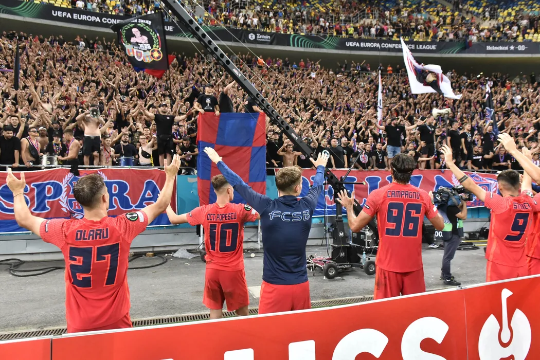 Fotbalistii stelisti saluta galeria dupa meciul de fotbal dintre FCSB si RSC Anderlecht Bruxelles, din cadrul grupelor UEFA Europa Conference League, desfasurat pe Arena Nationala din Bucuresti, joi 15 septembrie 2022. © FOTO:Razvan Pasarica/SPORT PICTURES