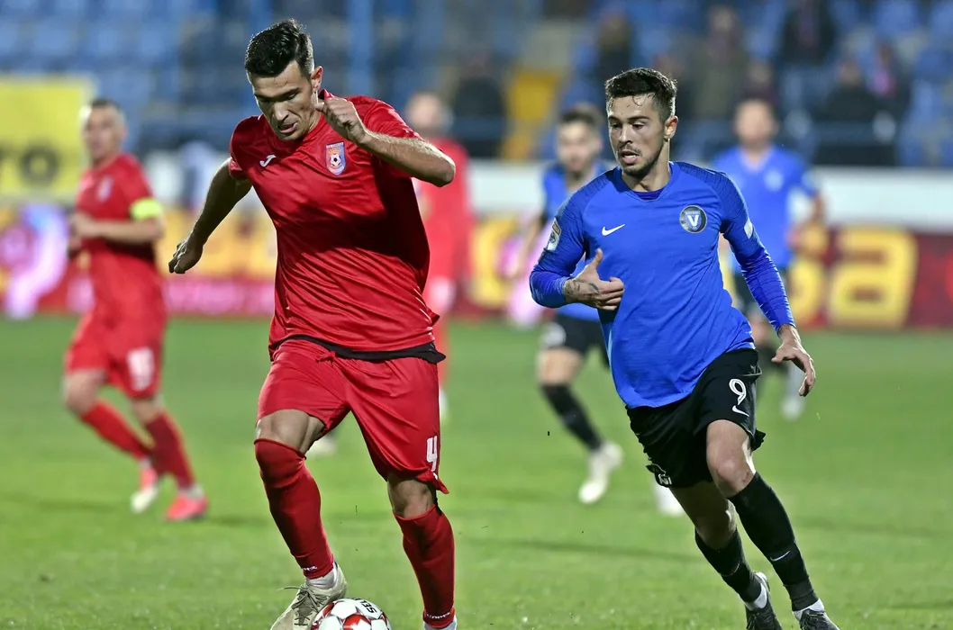 Louis Munteanu si Gabi Iancu in meciul de fotbal dintre FC Viitorul si Chindia Targoviste, contand pentru Liga 1 Casa Pariurilor, desfasurat pe Stadionul central al Academiei Gheorghe Hagi din Ovidiu, vineri 1 noiembrie 2019. © FOTO:Razvan Pasarica/SPORT PICTURES
