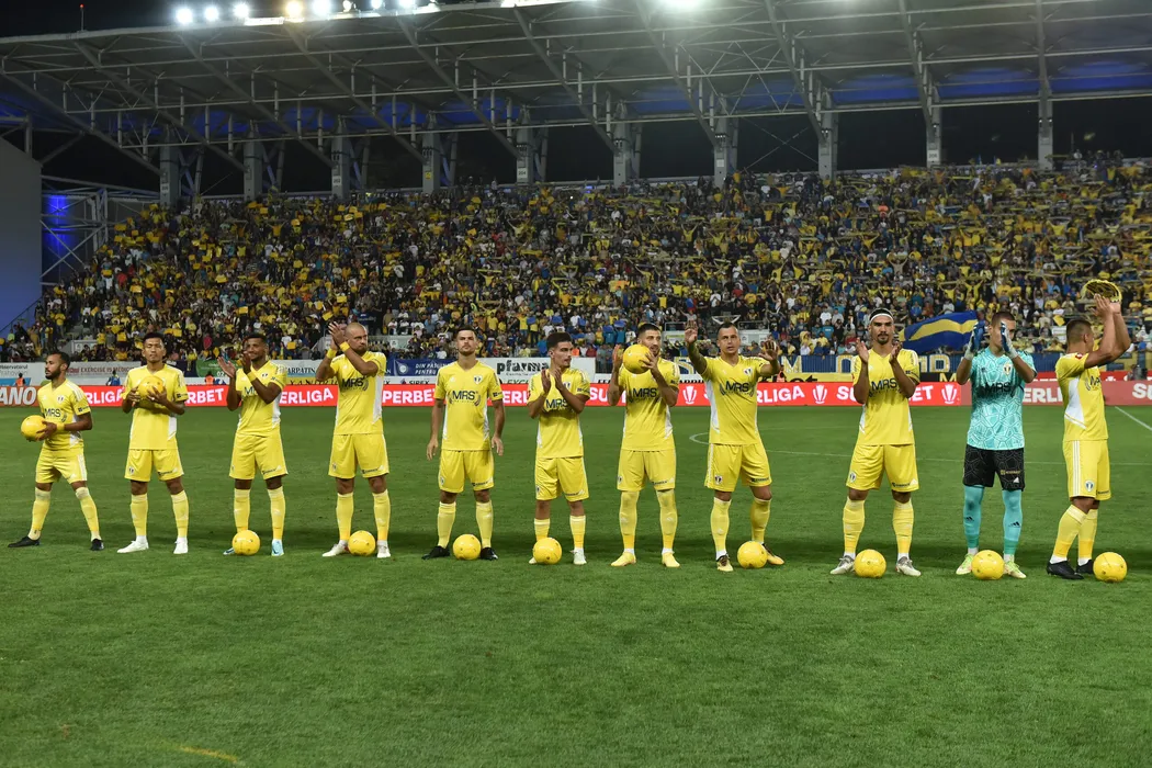 Fotbalistii ploiesteni la startul meciului de fotbal dintre Petrolul Ploiesti si Rapid Bucuresti, contand pentru Superliga Superbet, desfasurat pe Stadionul Ilie Oana din Ploiesti, sambata 13 august 2022. © FOTO:Razvan Pasarica/SPORT PICTURES