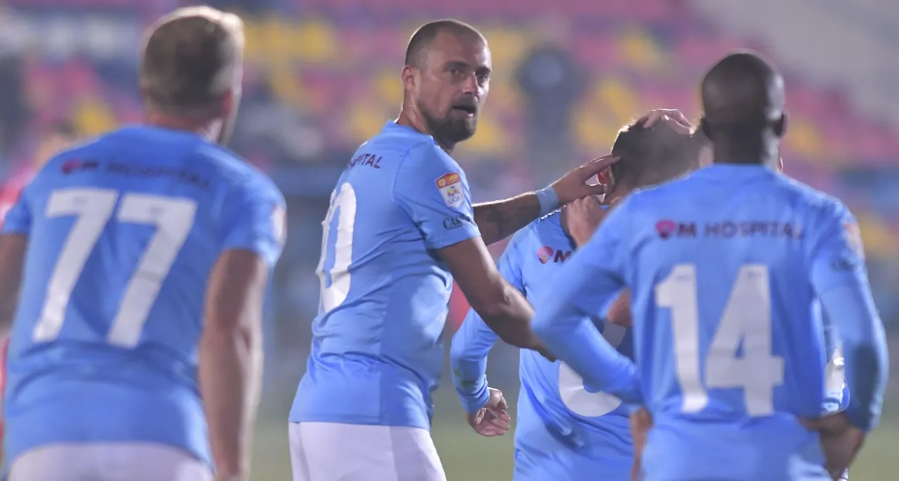Gabriel Sebastian Tamas il felicita pe Ion Gheorghe dupa un gol marcat in meciul de fotbal dintre FC Voluntari si Dinamo Bucuresti, contand pentru Liga 1 Casa Pariurilor, desfasurat pe Stadionul Anghel Iordanescu din Voluntari, luni 22 noiembrie 2021. © FOTO:Razvan Pasarica/SPORT PICTURES