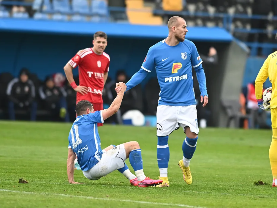 Denis Alibec il ajute sa se ridice pe Gabriel Andrei Torje in meciul de fotbal dintre Farul Constanta si FC Botosani, contand pentru Superliga Superbet, desfasurat pe Stadionul central al Academiei Gheorghe Hagi din Ovidiu, duminica 4 decembrie 2022. © FOTO:Razvan Pasarica/SPORT PICTURES