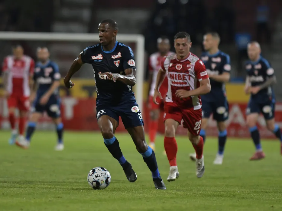 Nicolao Manuel Dumitru Cardoso si Gabriel Andrei Torje in meciul de fotbal dintre Dinamo Bucuresti si UTA Arad, contand pentru Play-out-ul Ligii 1 Casa Pariurilor, desfasurat pe Stadionul Dinamo din Bucuresti, vineri 13 mai 2022. © FOTO:Razvan Pasarica/SPORT PICTURES