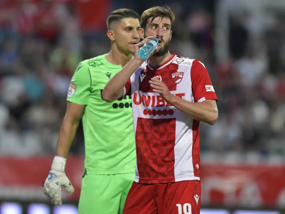 Bruno Patrick Aloe Baptiste se hidrateaza in meciul de fotbal dintre Dinamo Bucuresti si UTA Arad, contand pentru Play-out-ul Ligii 1 Casa Pariurilor, desfasurat pe Stadionul Dinamo din Bucuresti, vineri 13 mai 2022. © FOTO:Razvan Pasarica/SPORT PICTURES