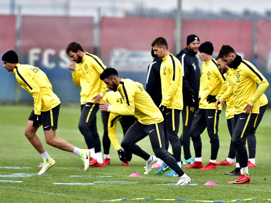Fotbalistii Stelei Gabriel Enache si Ovidiu Popescu efectueza antrenamentul oficial inaintea meciului din cadrul Ligii Europa impotriva celor de la FC Lugano, miercuri 6 decembrie 2017 la baza de antrenament FCSB din Berceni. © FOTO Razvan Pasarica/SPORT PICTURES
