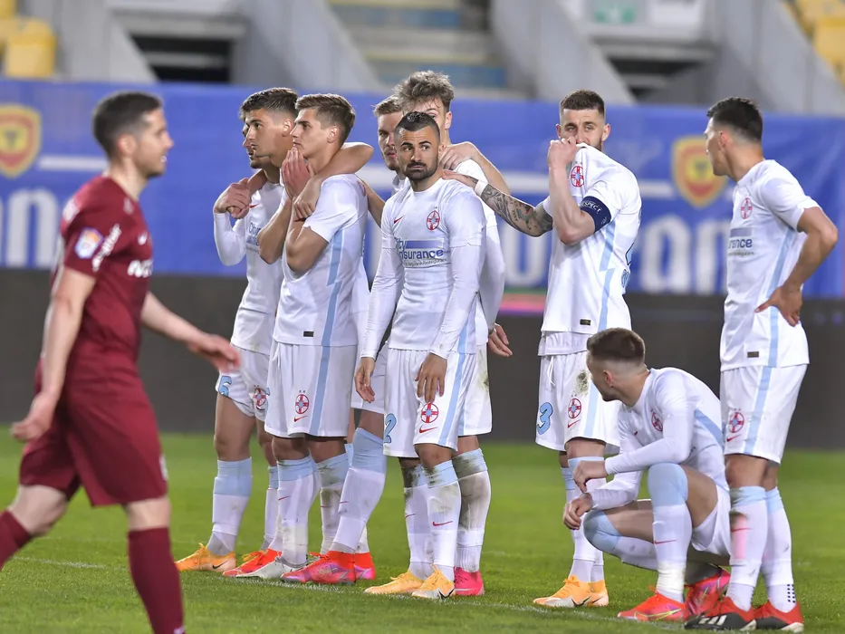 Fotbalistii stelisti Denis Gratian Harut, Gabriel Bogdan Simion, Valentin Cretu si Ovidiu Marian Popescu urmaresc penaltyurile in meciul de fotbal dintre CFR Cluj si FCSB, Supercupa Romaniei, desfasurat fara spectatori pe Stadionul Ilie Oana din Ploiesti, joi 15 aprilie 2021. © FOTO:Razvan Pasarica/SPORT PICTURES