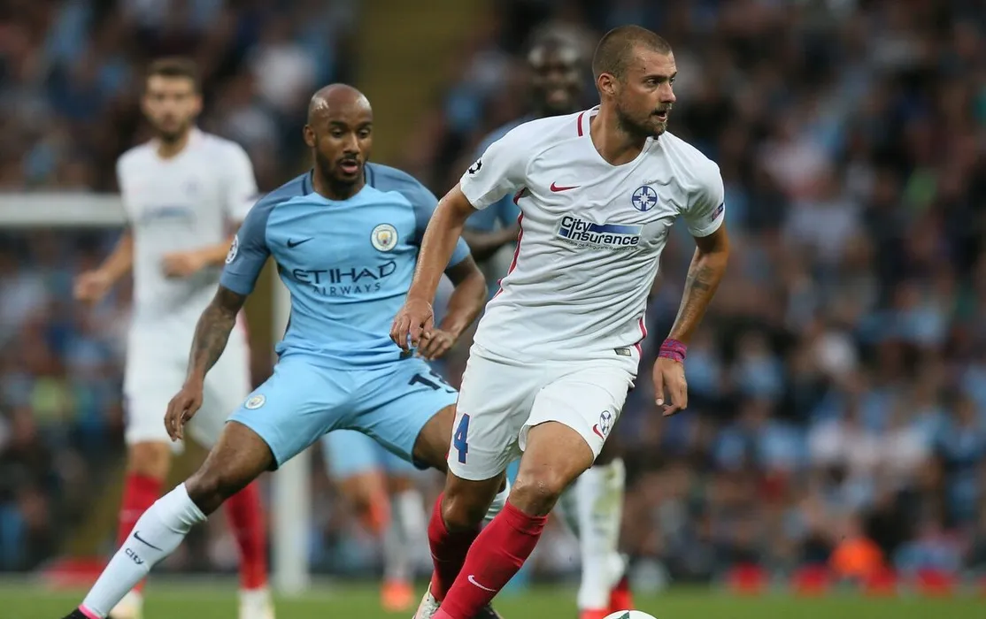 Gabriel Tamas of Steaua Bucharest and Fabian Delph of Manchester City during the UEFA Champions League qualifying match between Manchester City and Steaua Bucharest held at the Etihad Stadium, Manchester on August 24th 2016