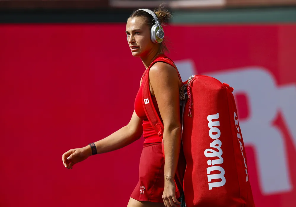 March 12, 2025 Aryna Sabalenka walks onto the court before her match against Sonay Kartal (GBR) during the 2025 BNP Paribas Open at Indian Wells Tennis Garden in Indian Wells, California. Mandatory Photo Credit: Charles Baus/CSM (Credit Image: � Charles Baus/CSM via ZUMA Press Wire)
