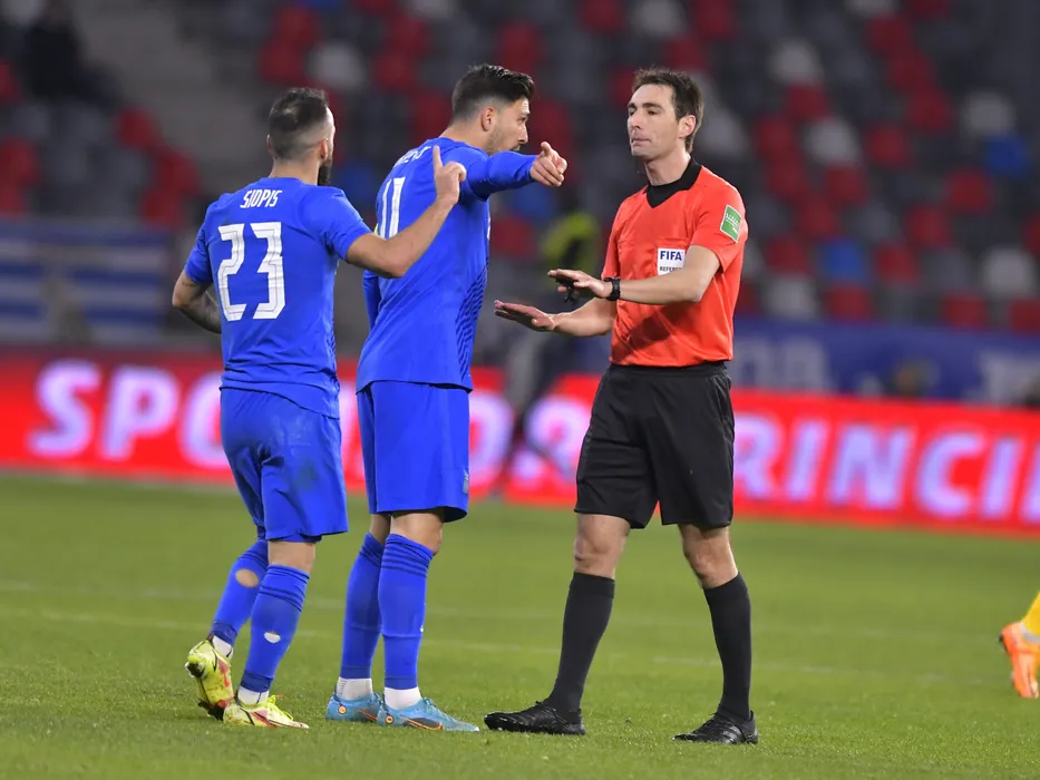 Arbitrul central Ricardo De Burgos Bengoechea discuta cu fotbalistii greci Tasos Bakasetas si Manolis Siopis in meciul amical de fotbal dintre Romania si Grecia, desfasurat pe Stadionul Steaua din Bucuresti, vineri 25 martie 2022. © FOTO:Razvan Pasarica/SPORT PICTURES