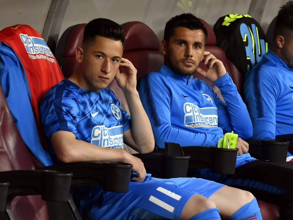 Olimpiu Morutan si Florentin Matei pe banca Stelei in meciul de fotbal dintre FCSB si CFR Cluj, din cadrul playoff-ului Ligii 1 Betano, desfasurat pe Arena Nationala din Bucuresti, duminica 19 mai 2019. © FOTO:Razvan Pasarica/SPORT PICTURES