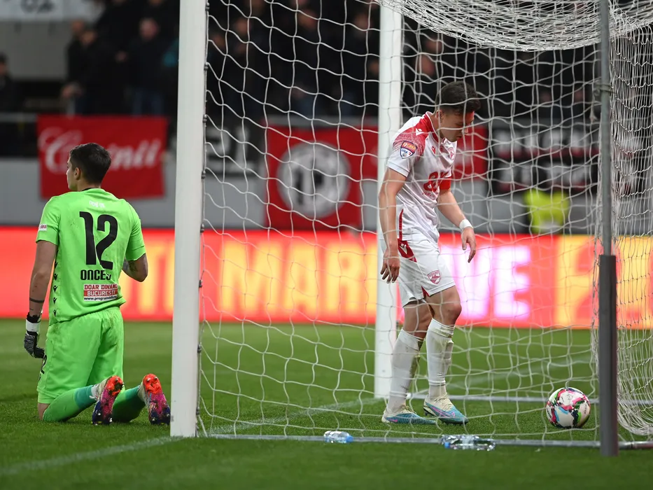 Denis Oncescu si Deniz Giafer suparati dupa un gol primit in meciul de fotbal dintre Dinamo Bucuresti si Politehnica Iasi, contand pentru Play-off-ul Ligii a-2-a, desfasurat pe Stadionul National Arcul de Triumf din Bucuresti, marti 25 aprilie 2023. © FOTO:Razvan Pasarica/SPORT PICTURES
