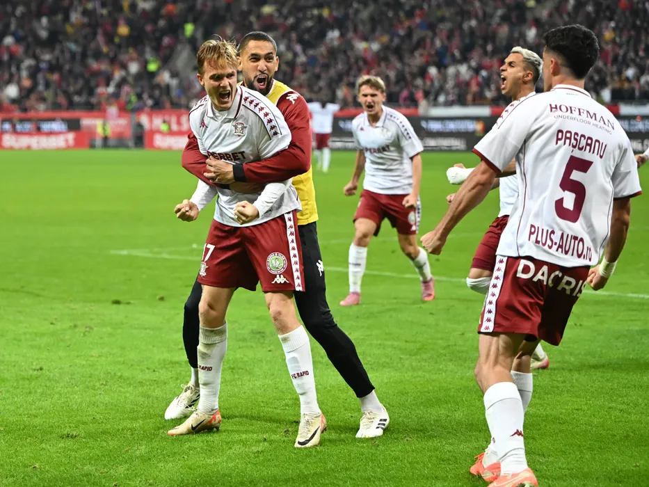 Bucurie a fotbalistilor rapidisti Tobias Christensen, Cristian Marian Manea si Alexandru Stefan Pascanu dupa un gol marcat in meciul de fotbal dintre Dinamo Bucuresti si Rapid Bucuresti, din cadrul Superligii Superbet, desfasurat pe Arena Nationala din Bucuresti, duminica 19 octombrie 2025. © FOTO:Razvan Pasarica/SPORT PICTURES