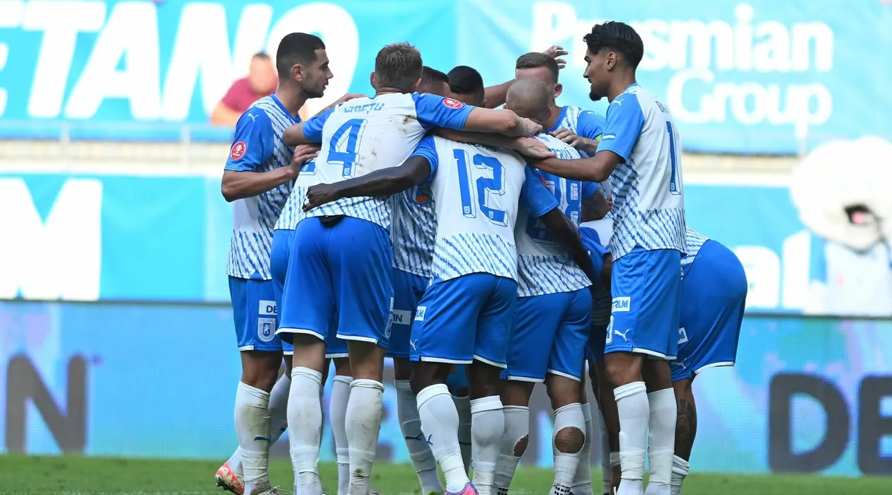Bucurie a fotbalistilor craioveni dupa un gol marcat cu Screciu Vladimir Ionut, Ionut Alexandru Mitrita si Stefan Baiaram in meciul de fotbal dintre Universitatea Craiova si FC Botosani, contand pentru Superliga Superbet, desfasurat pe Stadionul Ion Oblemenco din Craiova, duminica 1 octombrie 2023. © FOTO:Razvan Pasarica/SPORT PICTURES