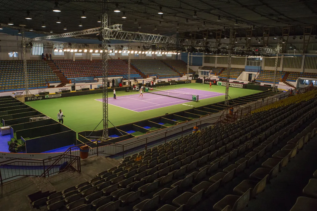 GALERIE FOTO | Primele schimburi de mingi din patinoarul în care se va juca tenis. Jucătoarele Spaniei au testat terenul de la Galați