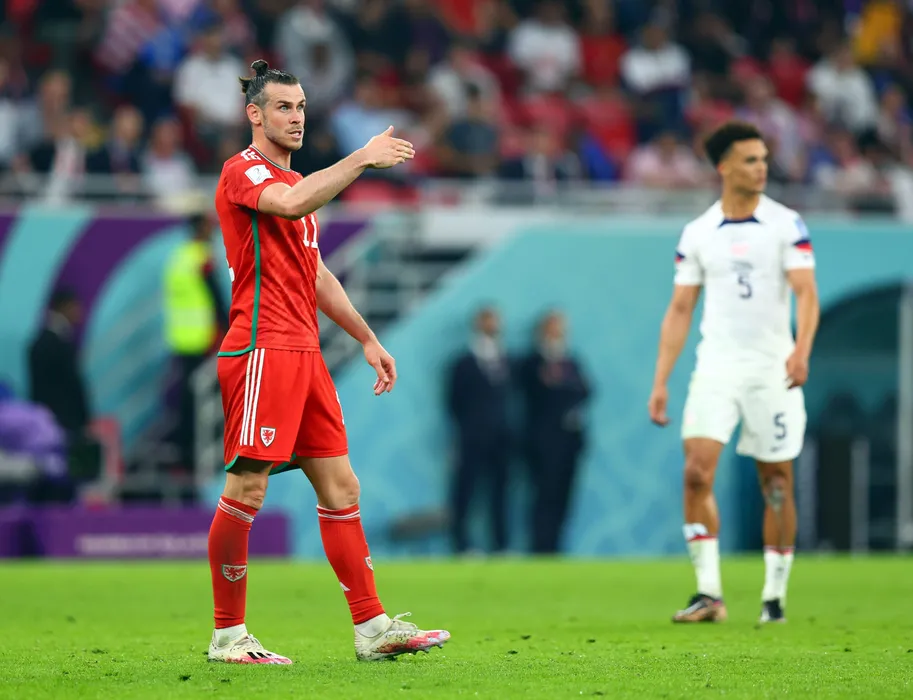 21 November 2022, Qatar, Al Rayyan: Wales' Gareth Bale (L) complains about a referee's decision during the FIFA World Cup Qatar 2022 Group B soccer match between USA and Wales at Al Rayyan Stadium. Photo:/dpa