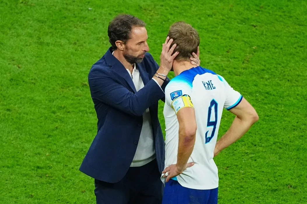 England Manager Gareth Southgate speaks with Harry Kane of England at full-time