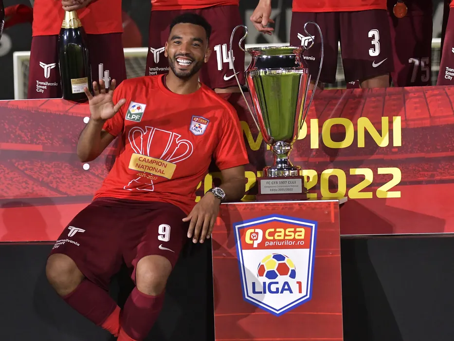 Billel Abdel Slem Omrani se bucura alaturi de trofeu dupa castigarea campionatului in urma meciului de fotbal dintre CFR Cluj si Universitatea Craiova, contand pentru Play-off-ul Ligii 1 Casa Pariurilor, desfasurat pe Stadionul CFR Dr. Constantin Radulescu din Cluj Napoca, duminica 15 mai 2022. © FOTO:Razvan Pasarica/SPORT PICTURES