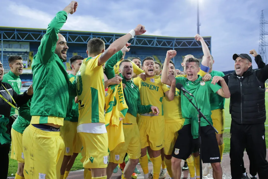 Meciul dintre AFC Hermannstadt (echipament alb/rosu) si CS Mioveni (echipament galben) din returul barajului de promovarea/mentinere in Liga 1, disputat pe stadionul Gaz Metan din Medias, miercuri, 2 iunie 2021. OVIDIU MATIU/ MEDIAFAX FOTO