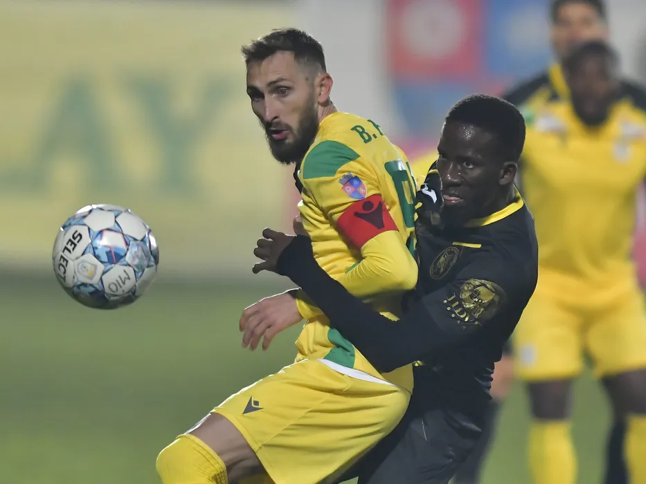 Gheorghe Bogdan Rusu si Adama Yves Sarr in meciul de fotbal dintre CS Mioveni si Gaz Metan Medias, contand pentru Liga 1 Casa Pariurilor, desfasurat pe Stadionul Orasenesc din Mioveni, luni 22 noiembrie 2021. © FOTO:Razvan Pasarica/SPORT PICTURES