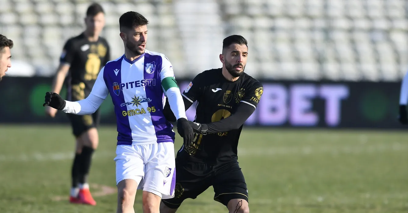 Ionut Adrian Serban si Ricardo Jorge Oliveira Valente in meciul de fotbal dintre FC Arges si Gaz Metan Medias, contand pentru Liga 1 Casa Pariurilor, desfasurat fara spectatori pe Stadionul Nicolae Dobrin din Pitesti, duminica 17 ianuarie 2021. © FOTO:Razvan Pasarica/SPORT PICTURES