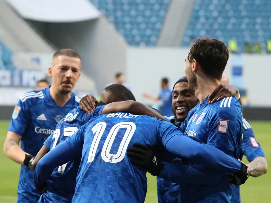 Fotbalistii craioveni se bucura dupa un gol marcat in meciul de fotbal dintre FC U Craiova 1948 si FC Botosani, contand pentru Liga 1 Casa Pariurilor, desfasurat pe Stadionul Ion Oblemenco din Craiova, joi 10 februarie 2022. © FOTO:Catalin Ciupureanu/SPORT PICTURES